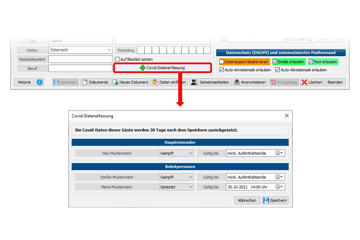 Um den 3G-Nachweis eines Gasts und seiner Begleitpersonen zu erfassen klicken Sie am unteren Ende der jeweiligen Gästekartei auf „Covid-Datenerfassung„: