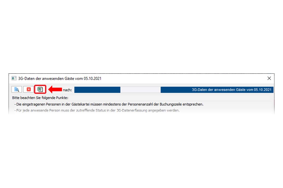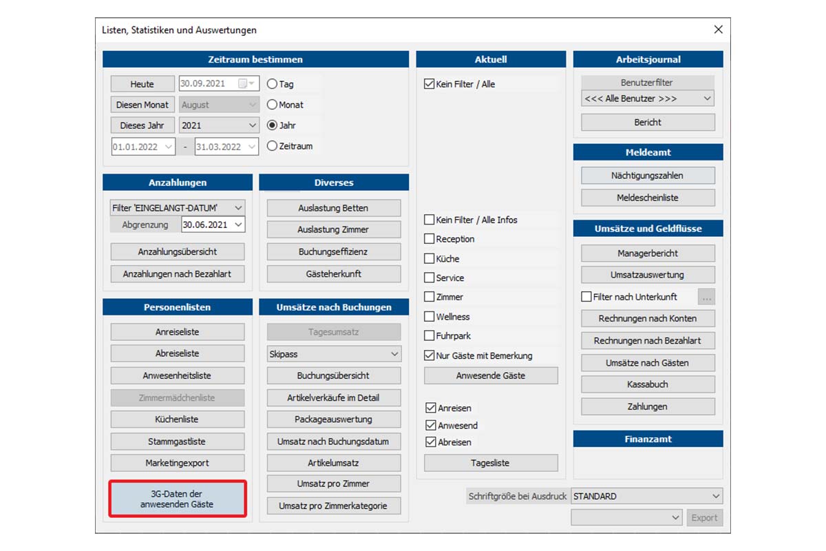 Im Menü „Listen und Auswertungen“ können Sie nun unter dem Punkt „Personenlisten“ die 3G-Daten der anwesenden Gäste täglich abrufen und einsehen. Klicken Sie dazu auf „3G-Daten der anwesenden Gäste„: