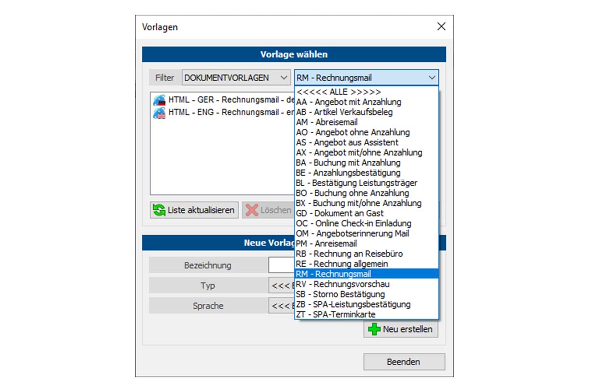 Jetzt können Sie die gewünschte Vorlage für das Rechnungsmail auswählen. Die Vorlagen sind standardmäßig in Deutsch und Englisch verfügbar und sind bereits im Update integriert. Bestätigen Sie Ihre Auswahl mit OK um das Rechnungsmail mit Hilfe der Vorlage zu erstellen.