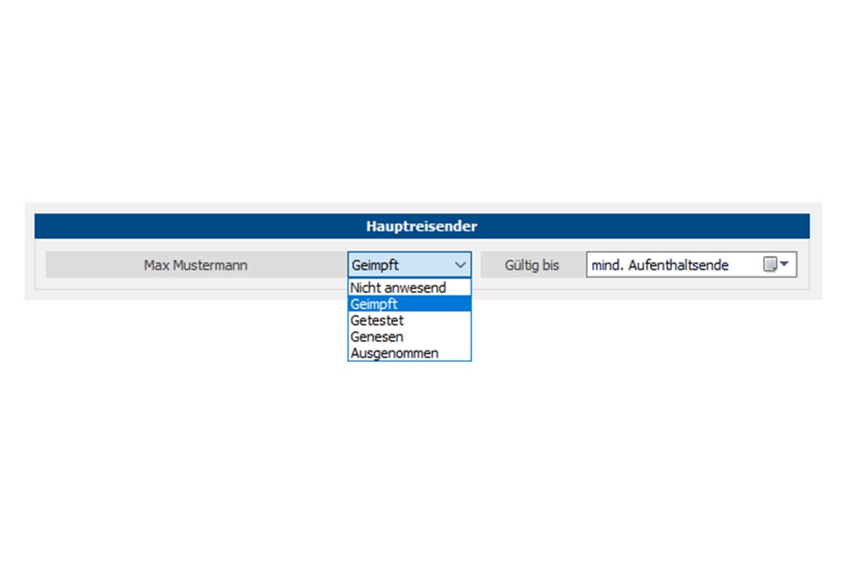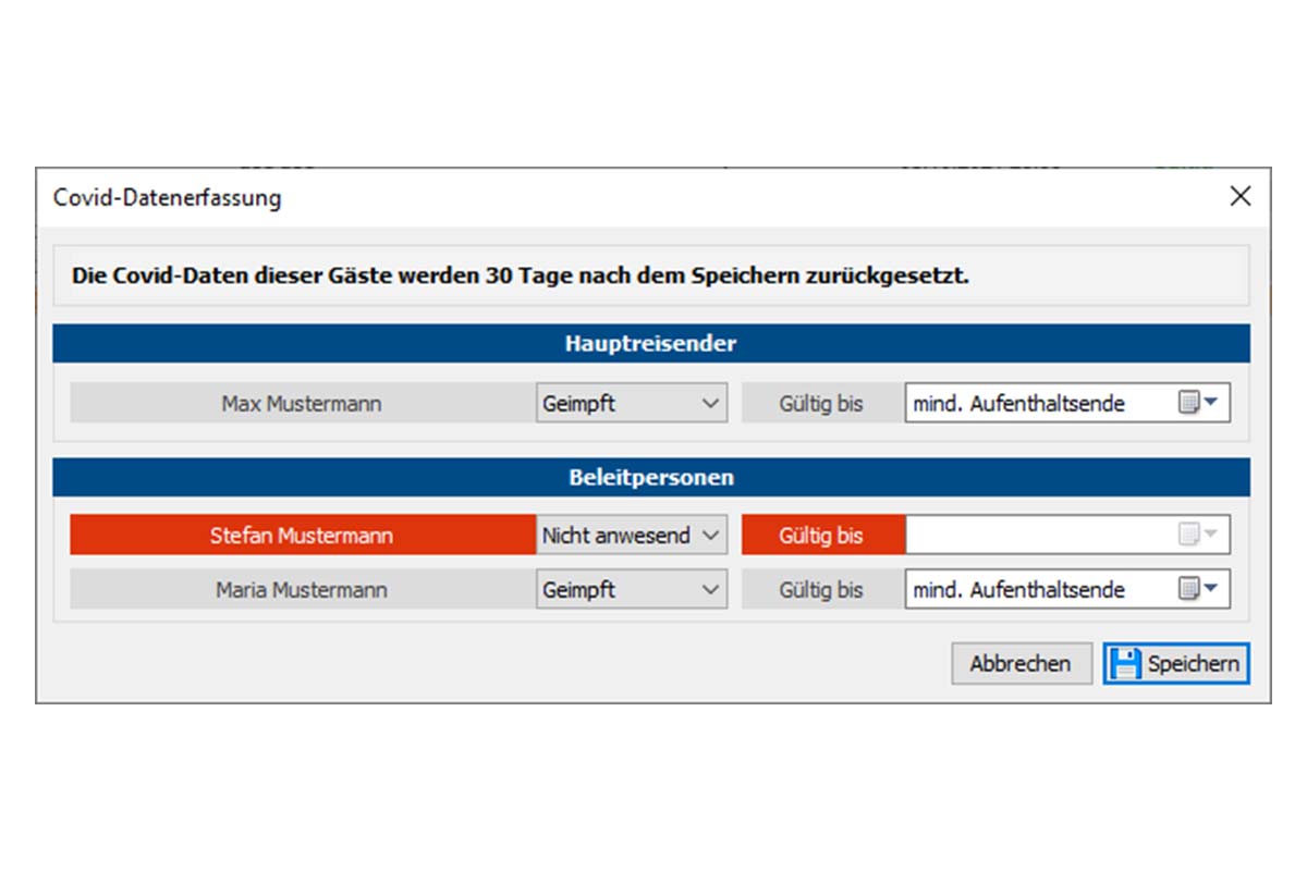 Im Fenster „Covid-Datenerfassung“ finden Sie nun Einträge zu dem Hauptreisenden und allen eingetragenen Begleitpersonen aus der Gästekartei. Hier können Sie nun Gültigkeitsdauer des Nachweises und 3G-Status jeder einzelnen Person erfassen: