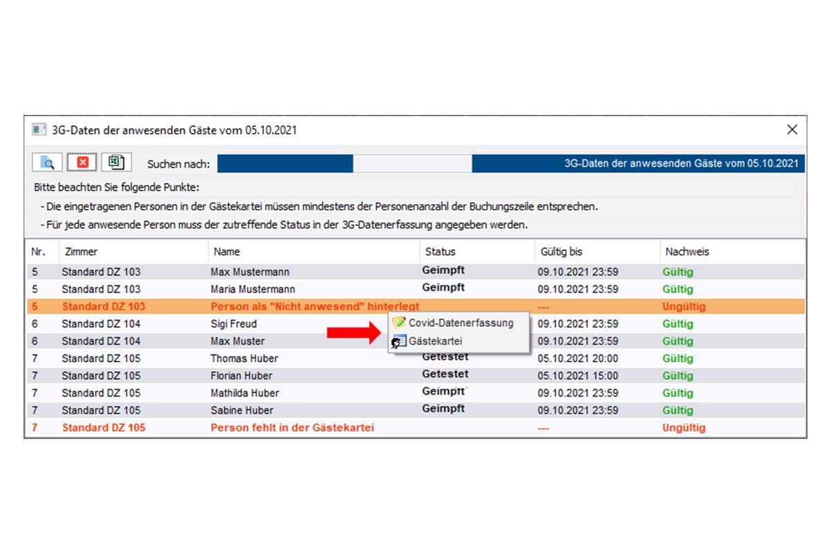 Sie können die Daten einer Person bzw. Gästekartei direkt in der Übersicht bearbeiten indem sie einen Rechtsklick auf der passenden Zeile durchführen. Danach können sie direkt in die Gästekartei oder in die Covid-Datenerfassung wechseln um die Daten zu vervollständigen und um die 3G-Informationen zu aktualisieren.