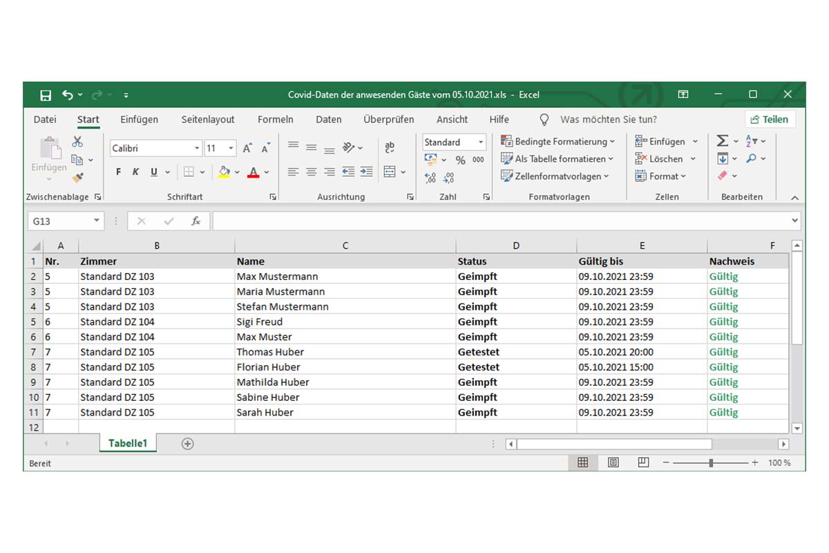 - Ausgenommen: Der Gast erscheint in der Übersichtsliste, aber der zugehörige Nachweis wird als „Nicht notwendig“ ausgewiesen.