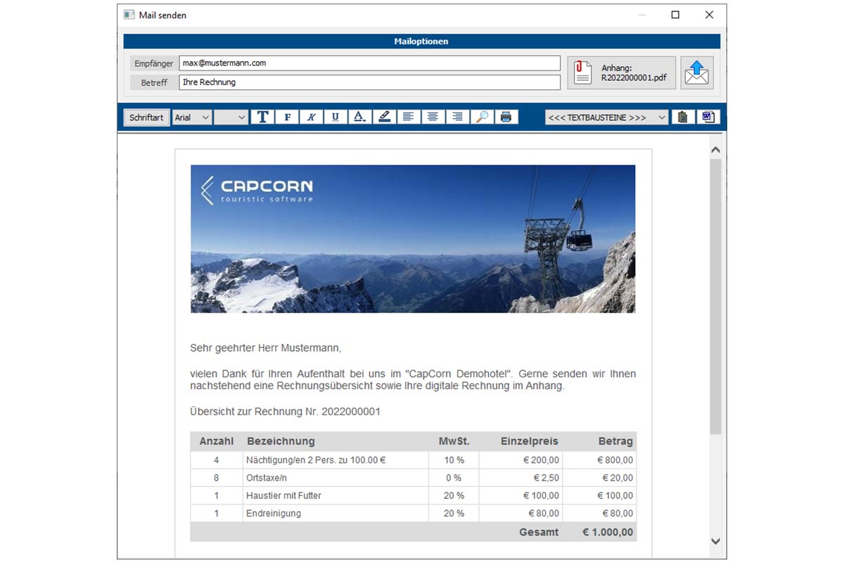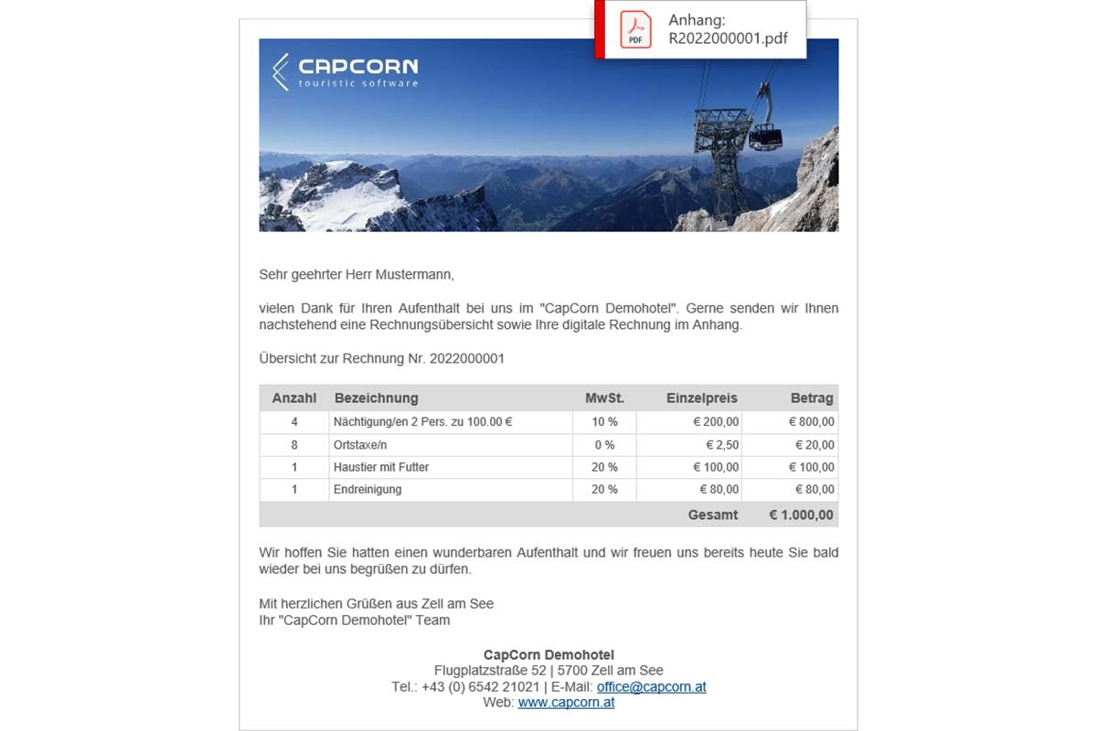 Wenn Sie Ihren Gästen ein Rechnungsmail senden erhalten diese eine praktische Rechnungsübersicht sowie die vollständige Rechnung im E-Mail-Anhang als PDF-Dokument. Die Rechnungsmails lassen sich wie gewohnt personalisieren und können nach Belieben an das eigene Branding angepasst werden.