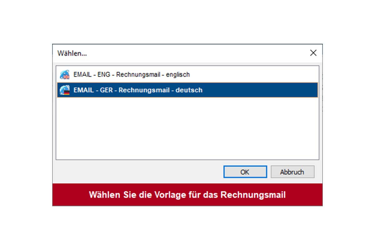 Jetzt können Sie die gewünschte Vorlage für das Rechnungsmail auswählen. Die Vorlagen sind standardmäßig in Deutsch und Englisch verfügbar und sind bereits im Update integriert. Bestätigen Sie Ihre Auswahl mit OK um das Rechnungsmail mit Hilfe der Vorlage zu erstellen.