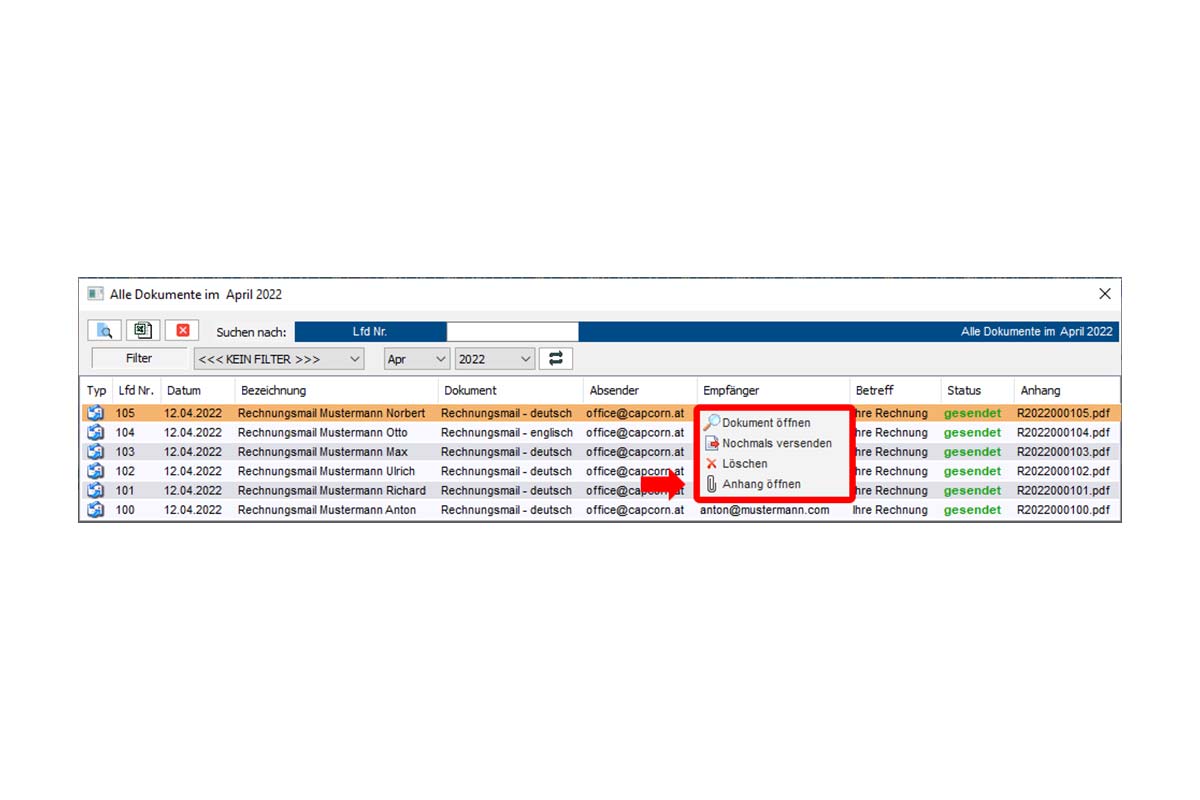 Im Menüpunkt Dokumente können die Rechnungsmails jederzeit wieder eingesehen und erneut versendet werden. Die Rechnung im Anhang lässt sich mit einem Rechtsklick und der Option „Anhang öffen“ ebenfalls erneut einsehen.
