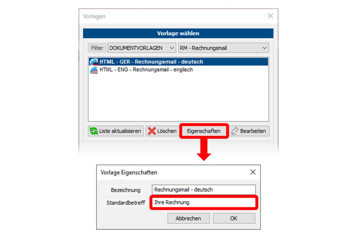 Der Betreff welcher beim Mailversand verwendet wird kann auch pro Vorlage individuell eingestellt werden. Wählen Sie dazu die gewünschte Vorlage aus und klicken Sie auf „Eigenschaften“. Im folgenden Fenster können Sie den Betreff frei eingeben.